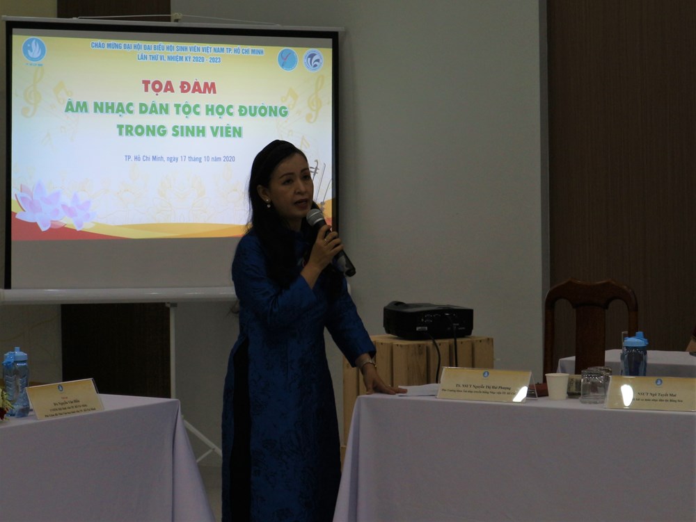 Tiếp nối thành công chuỗi hoạt động của chương trình năm nay, toạ đàm “Âm nhạc dân tộc học đường trong học sinh, sinh viên” với sự tham dự của các đơn vị có chuyên môn cao về âm nhạc dân tộc và các chuyên gia có nhiều kinh nghiệm nghiên cứu về các thể loại âm nhạc truyền thống như: NSƯT Ngô Tuyết Mai, NSƯT Huỳnh Khải, NSƯT Hải Phượng, TS Mai Mỹ Duyên... Toạ đàm đã mang đến những kiến thức về âm nhạc dân tộc, tình hình phát triển và vai trò của âm nhạc dân tộc học đường trong đời sống nói chung và giới trẻ nói riêng. Đồng thời, tại toạ đàm các chuyên gia khách mời và các đơn vị chuyên môn đã tiến hành trao đổi về thực trạng của việc thực hiện chương trình “Âm nhạc dân tộc học đường” giai đoạn 2015 – 2020 qua đó gợi hướng mô hình, giải pháp phát triển âm nhạc dân tộc học đường trong sinh viên nhiệm kỳ VI (2020 – 2023).