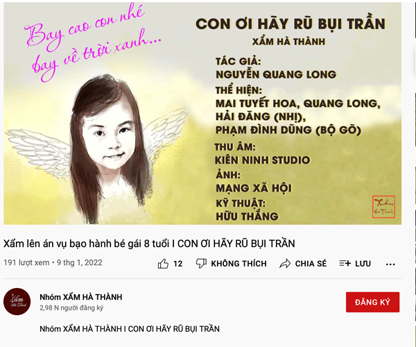 VHO- Nhóm Xẩm Hà Thành vừa ra mắt bài xẩm mang tên Con ơi hãy rũ bụi trần về câu chuyện đau lòng của bé gái 8 tuổi bị bạo hành đến chết gây bức xúc dư luận thời gian qua.