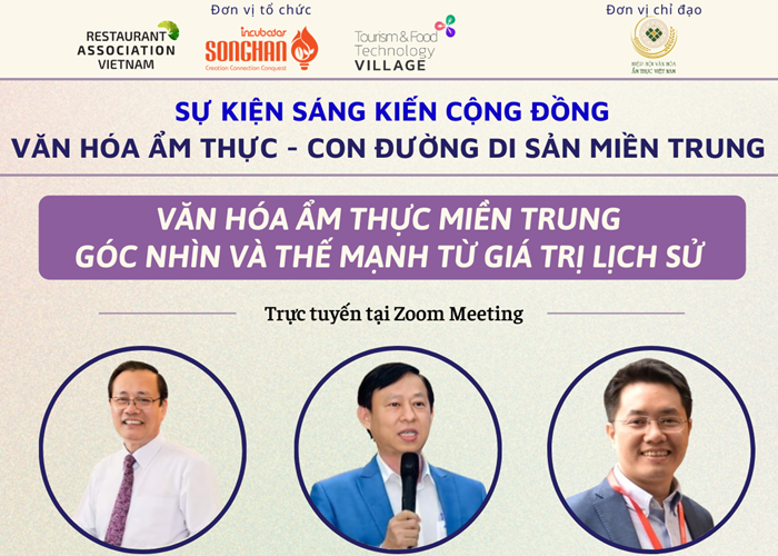 Sự kiện đầu tiên diễn ra vào sáng 17.7 với chủ đề Văn hóa ẩm thực miền Trung- Góc nhìn và thế mạnh từ giá trị lịch sử. 3 diễn giả sẽ tham gia chương trình gồm: ông Lê Tân, Phó Chủ Tịch, Tổng Thư Ký VCCA; ông Lý Đình Quân, Tổng Giám Đốc Songhan Incubator; ông Chử Hồng Minh, nhà sáng lập, Chủ Tịch RAV.