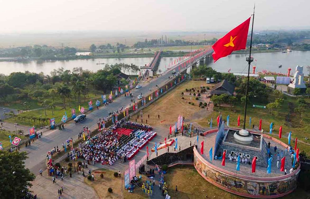Trong không khí trang nghiêm, lá cờ đỏ sao vàng được kéo lên trên đỉnh kỳ đài phía Bắc cầu Hiền Lương- sông Bến Hải, nơi đã trực tiếp chứng kiến nỗi đau chia cắt suốt hơn 20 năm của hai miền Nam- Bắc.