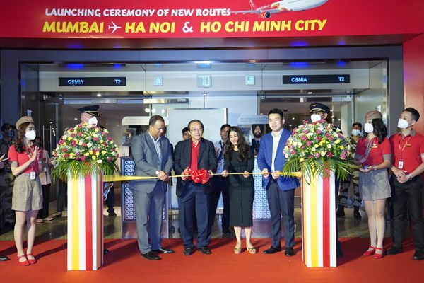 Lễ khai trương hai đường bay lịch sử từ Hà Nội, TP.HCM đến Mumbai được diễn ra tại sân bay quốc tế Chhatrapati Shivaji Maharaj (Mumbai, Ấn Độ) với sự tham gia của lãnh đạo Tổng lãnh sự Việt Nam tại Mumbai, lãnh đạo sân bay, đại diện Vietjet cùng các hành khách.