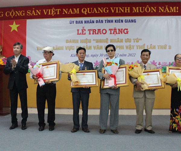 VHO- Sáng 30.12, tại Sở Văn hóa và Thể thao tỉnh Kiên Giang đã diễn ra lễ trao tặng và truy tặng danh hiệu vinh dự Nhà nước “Nghệ nhân ưu tú” (NNƯT) trong lĩnh vực Di sản văn hóa phi vật thể lần thứ ba năm 2022 cho 6 cá nhân của tỉnh Kiên Giang.