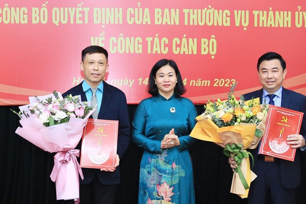 Phó Bí thư Thường trực Thành ủy Nguyễn Thị Tuyến trao Quyết định cho ông Nguyễn Minh Đức và ông Nguyễn Thành Lợi. Ảnh: Quang Thái