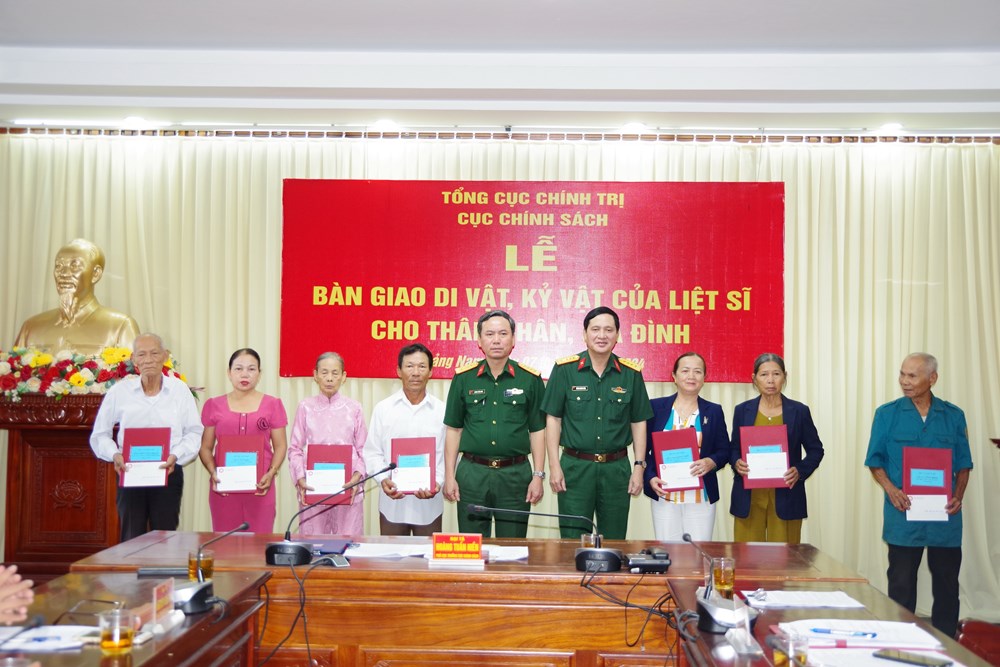 Tại lễ bàn giao, Đại tá Hoàng Tuấn Hiền, Phó Cục trưởng Cục Chính sách và Đại tá Dương Hoàng Toán, Phó Chủ nhiệm Chính trị Quân khu 5 đã trao tận tay từng di vật, kỷ vật của các liệt sĩ cho thân nhân và gia đình.