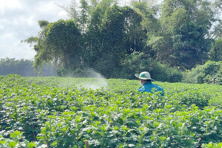 Gia đình ông Bùi Phát (51 tuổi), thôn Đồng Viên, xã Nghĩa Hiệp đang tất bật nhổ cỏ, phun thuốc phòng bệnh cho hoa cúc. “Vụ Tết này tôi trồng hơn 1.000 chậu cúc. Thời tiết hay có mưa dầm nên phải chủ động phun thuốc chống nấm và giúp lá xanh tươi. Phần lớn hoa trong vườn cũng đã được đặt mua”, ông Phát nói.