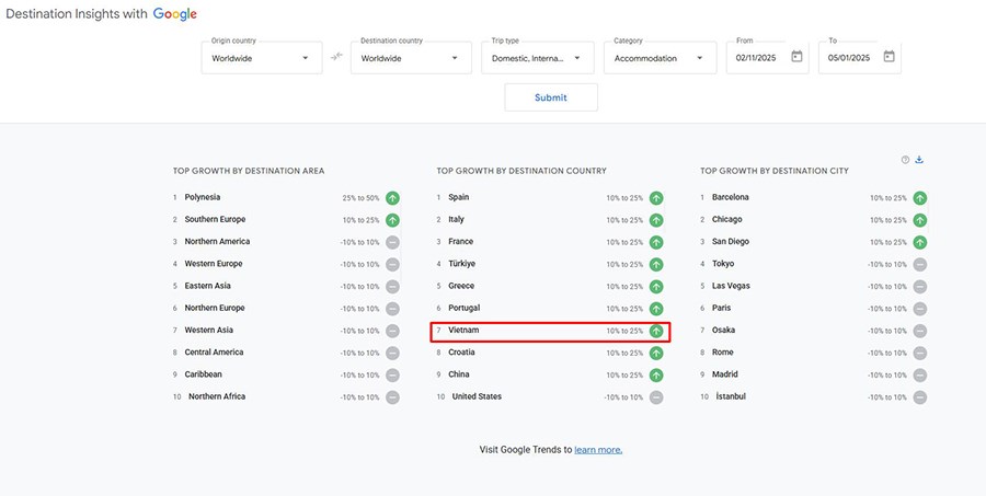 VHO - Dữ liệu tổng hợp từ công cụ theo dõi xu hướng du lịch Google Destination Insights cho thấy Việt Nam có mức tăng trưởng điểm đến cao thứ 7 toàn cầu.