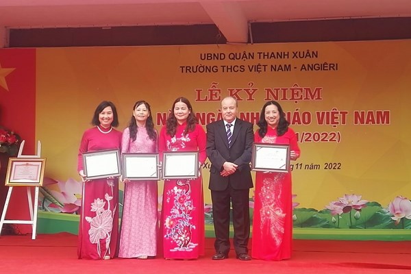 Trong những năm qua, thầy trò nhà trường đã đạt được nhiều thành tích trong giảng dạy và học tập; nhiều giáo viên đạt giáo viên dạy giỏi cấp thành phố và cấp quận; nhiều học sinh đạt được thành tích cao trong các kỳ thi học sinh giỏi. Bày tỏ sự xúc động khi tham dự buổi lễ, ngài Đại sứ Abdelhamid Boubazine gửi lời cảm ơn những đóng góp của thầy trò nhà trường vào các hoạt động của lễ kỷ niệm 60 năm ngày quan hệ ngoại giao giữa 2 nước Việt Nam và Algeria, đặc biệt là tiết mục văn nghệ của các em học sinh tại Lễ kỷ niệm chính thức được tổ chức vào tháng 10 vừa qua. “Lời cảm ơn của tôi không thể nói lên hết sự trân trọng và biết ơn của tôi đối với lãnh đạo, thầy cô và học sinh THCS Việt Nam – Angeria. Buổi lễ làm chúng tôi nhớ lại quãng thời gian các con tôi còn ngồi trên ghế nhà trường. Tôi muốn nhấn mạnh rằng, các thầy cô đang làm một công việc cao quý nhất bởi vì không gì cao quý hơn giáo dục và truyền bá tri thức. Các thầy cô xứng đáng được tôn vinh bởi những đóng góp cho sự nghiệp giáo dục và đào nên tạo thế hệ măng non của đất nước”, ngài Đại sứ Algeria tại Việt Nam phát biểu.