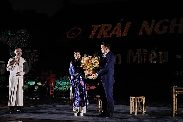 Giám đốc Trung tâm Hoạt động VHKH Văn Miếu – Quốc Tử Giám Lê Xuân Kiêu tặng hoa nhạc sĩ Đinh Khánh Ly