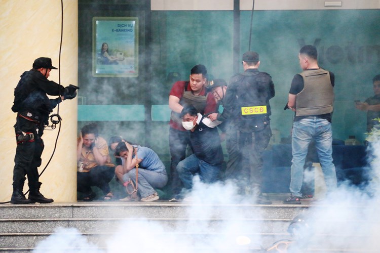Theo tình huống giả định các đối tượng dùng súng đe dọa nhân viên ngân hàng để lấy tiền