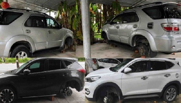 Dùng gạch kê xe lên rồi tháo trộm bánh