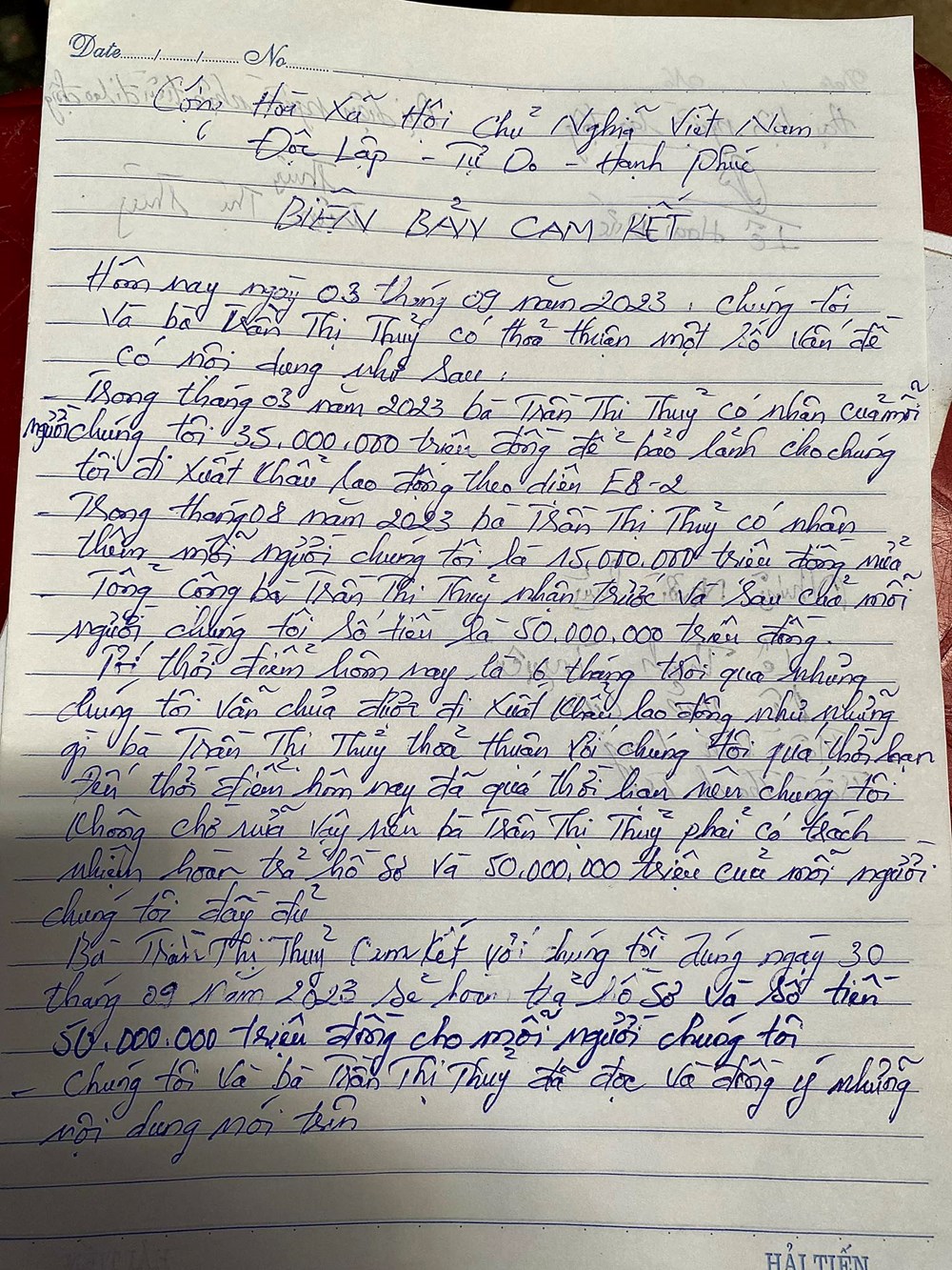Theo bà Chức, sau khi nộp tiền lần đầu, phía bà Th. có chuyển cho một mẫu giấy ghi tiếng nước ngoài và thúc giục đóng đủ 50 triệu đồng/người để có Visa đi lao động ngắn hạn. Hai vợ chồng tin tưởng gom góp chuyển đủ tiền, thậm chí còn chuẩn bị cả một số lương thực như cá khô, tôm khô để cuối tháng 5, chậm nhất là đầu tháng 6.2023 mang sang Hàn Quốc sử dụng.