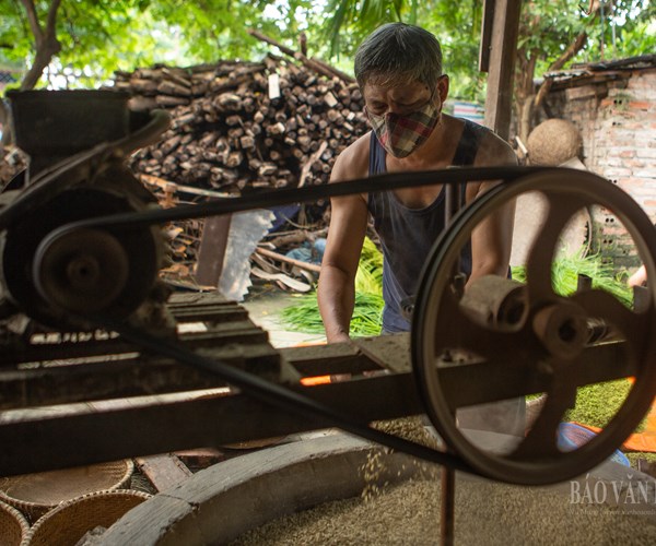 Ông Mạnh chia sẻ: "Cốm rang xong khi còn nóng là đem giã ngay trên bằng loại cối riêng, nhịp chày nhè nhẹ, nhịp nhàng, đều đều và khoan thai thì cốm mới mịn và dẻo".