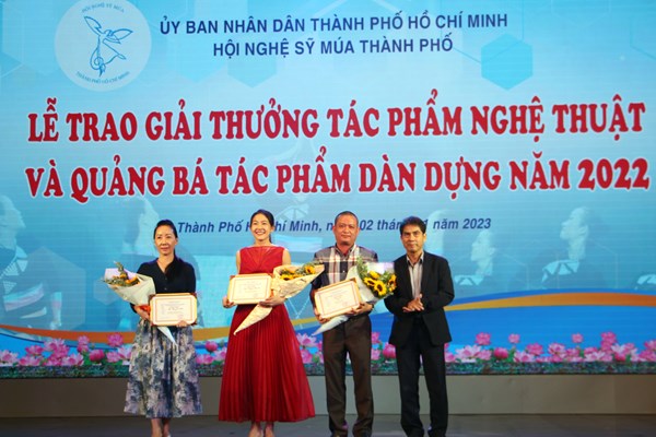 Giải thưởng tác phẩm nghệ thuật năm 2022 được Hội Nghệ sĩ Múa TP.HCM trao 9 tác phẩm. Trong đó, 3 tác phẩm đoạt giải A là: Trở về (biên đạo NSƯT Nguyễn Xuân Hùng), Hai thương một chờ (biên đạo NSƯT Trần Hoàng Yến và Đặng Minh Hiền), Đôi mắt của Biển (biên đạo Nguyễn Phúc Hùng và Huỳnh Đoan Trinh). 3 tác phẩm đoạt giải B là: Mầm (biên đạo Thạc sỹ Huỳnh Hồng Diễm), Con đường trên biển (biên đạo Lê Hải) và Mắt bão (biên đạo Hà Thanh Hậu). Giải C cũng có 3 tác phẩm là: Nụ cười xanh (biên đạo Phan Gia Sương); Khai (biên đạo Lê Hải) và Vĩnh kết đồng tâm (biên đạo Nguyễn Minh Nhật). |