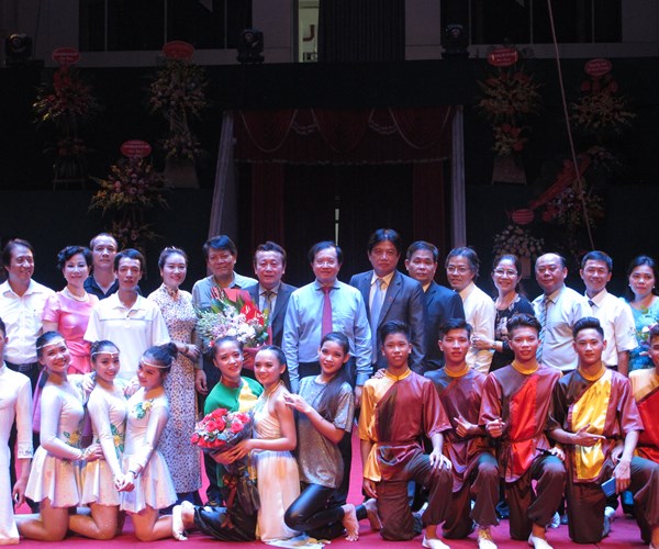 Thứ trưởng Tạ Quang Đông chụp ảnh lưu niệm với thầy và trò Trường Trung cấp nghệ thuật Xiếc và Tạp kỹ VN tại lễ khai giảng năm học mới