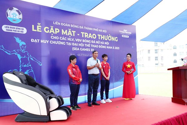 Tại buổi lễ, ông Tô Văn Động, Chủ tịch Liên đoàn Bóng đá thành phố Hà Nội gửi lời chúc mừng và cảm ơn HLV Mai Đức Chung cùng các HLV, VĐV bóng đá nữ của TP Hà Nội tham gia SEA Games 31