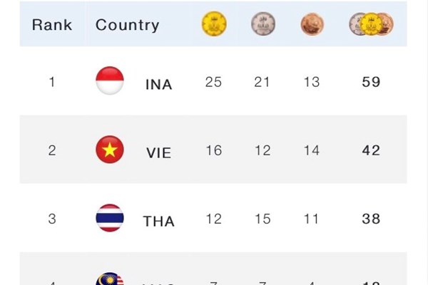 Với 7 tấm HCV từ môn bơi, 6 HCV môn cử tạ, 2 HCV môn điền kinh và 1 HCV môn cờ vua, Đoàn Thể thao Người khuyết tật Việt Nam giành được 16 HCV trong ngày ra quân ASEAN Para Games 12. Cùng với đó, các VĐV của chúng ta còn giành thêm 12 HCB và 14 HCĐ. Với 16 HCV, 12 HCB và 14 HCĐ (theo bảng xếp hạng của ban tổ chức tính đến lúc 21h30 ngày 4.6), Đoàn Thể thao Người khuyết tật Việt Nam tạm xếp thứ hai sau Indoneisa (25, 21, 13), xếp thứ ba là Thái Lan (12, 15, 11).