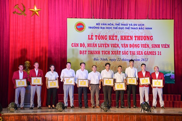 Tại Lễ trao thưởng, Trường Đại học TDTT Bắc Ninh đã tặng Giấy khen của nhà trường cho 3 tập thể và 30 là cá nhân cán bộ, HLV của nhà trường và 184 VĐV có thành tích xuất sắc tại SEA Games 31.