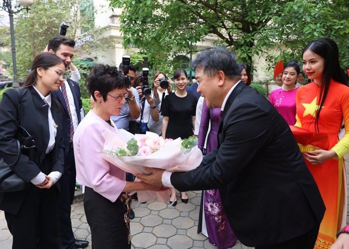 Đón tiếp đoàn phu nhân Chủ tịch nước Võ Văn Thưởng cùng phu nhân Toàn quyền Australia thăm Học viện Âm nhạc quốc gia có Thứ trưởng Bộ VHTTDL Trịnh Thị Thủy.