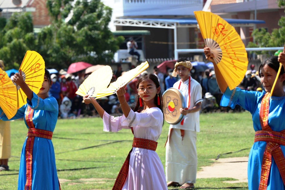 Sau nghi lễ đón rước là các tiết mục biểu diễn nghệ thuật đặc sắc của các chàng trai, cô gái Chăm từ các thôn: Hữu Đức, Tân Đức, Thành Đức trong trang phục truyền thống rực rỡ sắc màu cùng nhau cất lên những lời ca, tiếng hát ngân vang trong tiếng cồng chiêng rộn ràng.