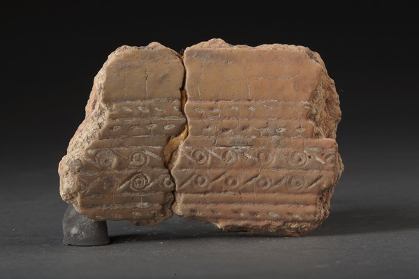 Mảnh khuôn đúc trống đồng (Mặt ngoài lưng trống) Đất nung, thế kỷ III-IV. Khai quật tại di tích Luy Lâu, Thuận Thành, Bắc Ninh