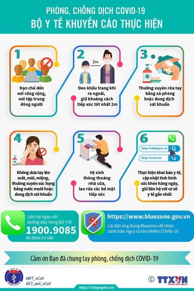 Liên hệ ngay với đường dây nóng Bộ Y tế: 1900.9095 để được tư vấn; cài đặt ứng dụng Bluezone để được cảnh báo nguy cơ lây nhiễm Covid-19: https://www.bluzone.gov.vn.