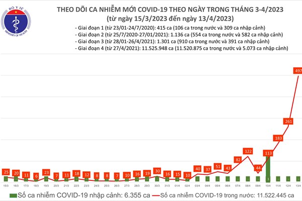 VHO- Ngày 13.4, số ca mắc mới Covid-19 là 497 người, tăng 236 ca ca so với ngày 12.4 (261 ca); và là ngày thứ 5 tăng liên tiếp kể từ ngày 9.4 với 44 ca. Sự gia tăng bắt đầu xuất hiện từ đầu tháng 4 với ca mắc mới tăng dần đều từ 15 ca đến 40, 51, 82 ca…; trong khi ở tháng 3, số ca mắc mới trong ngày cao nhất chỉ là 30 ca.